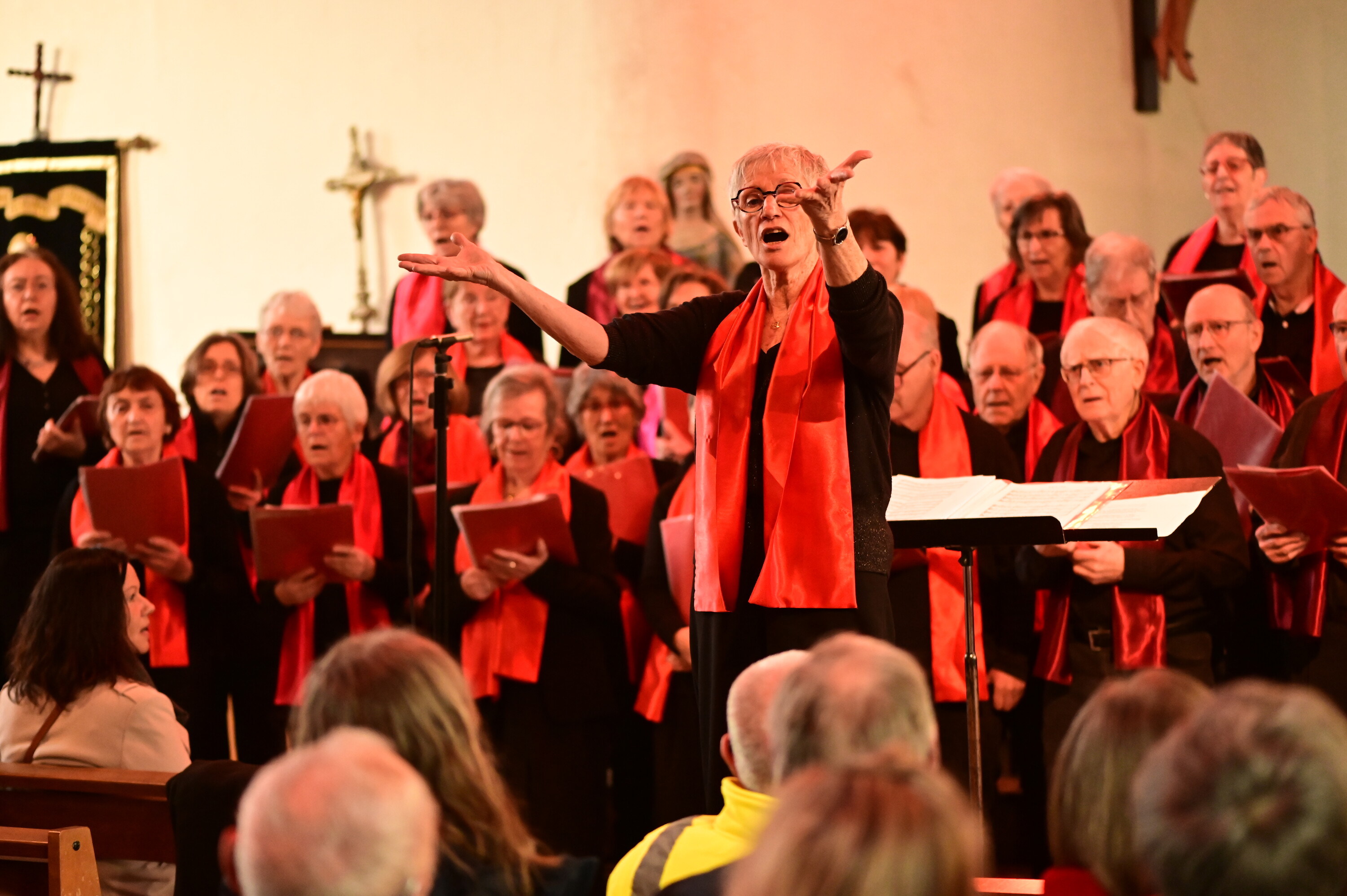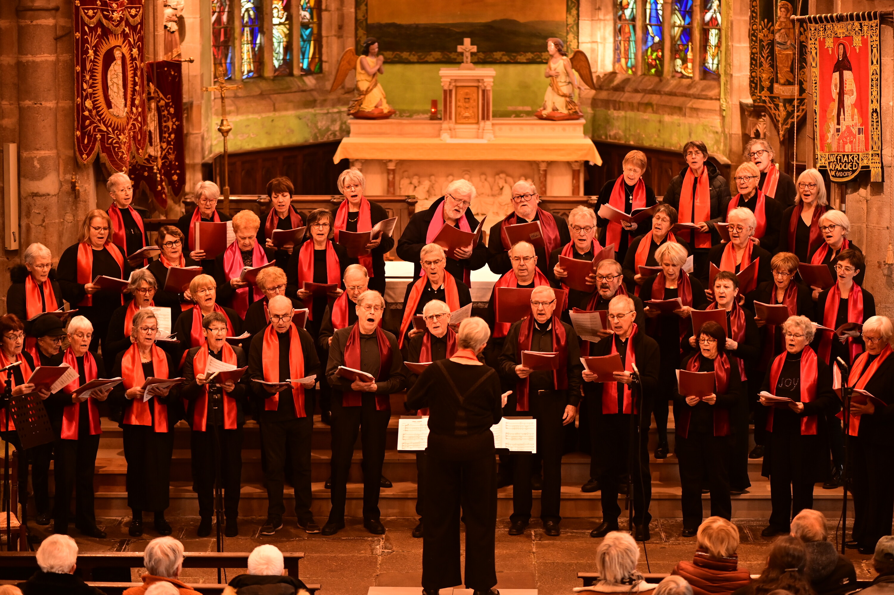 La chorale fête son 40 ème anniversaire par un concert à l'église Notre-Dame. Pour l'occasion, Jean-Pierre Le Meur reprend temporairement du service devant un public très fourni. (photo R. Quentel)